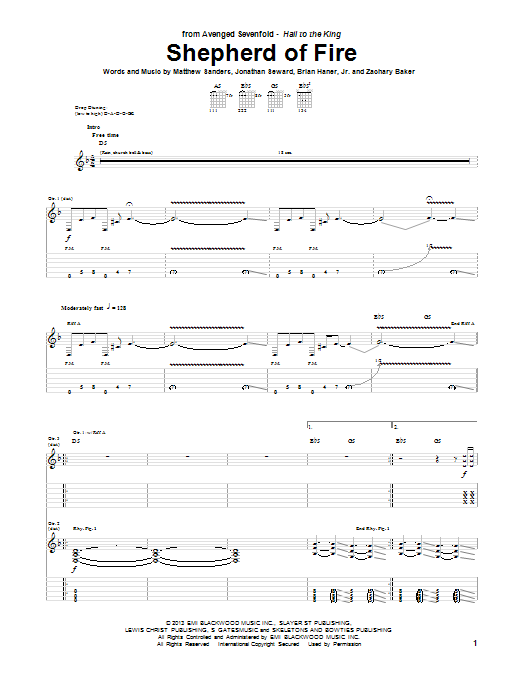 Download or print Avenged Sevenfold Shepherd Of Fire sheet music, chords and digital score arranged for Guitar Tab. This Pop score includes 13 page(s).
