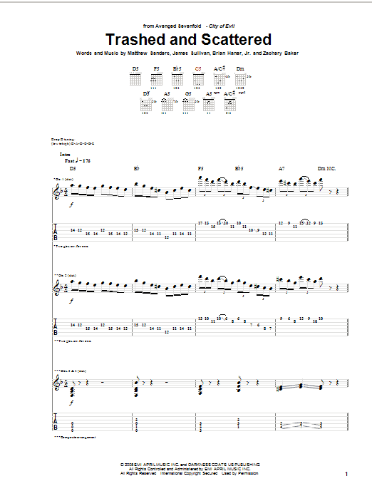 Download or print Avenged Sevenfold Trashed And Scattered sheet music, chords and digital score arranged for Guitar Tab. This Metal score includes 19 page(s).