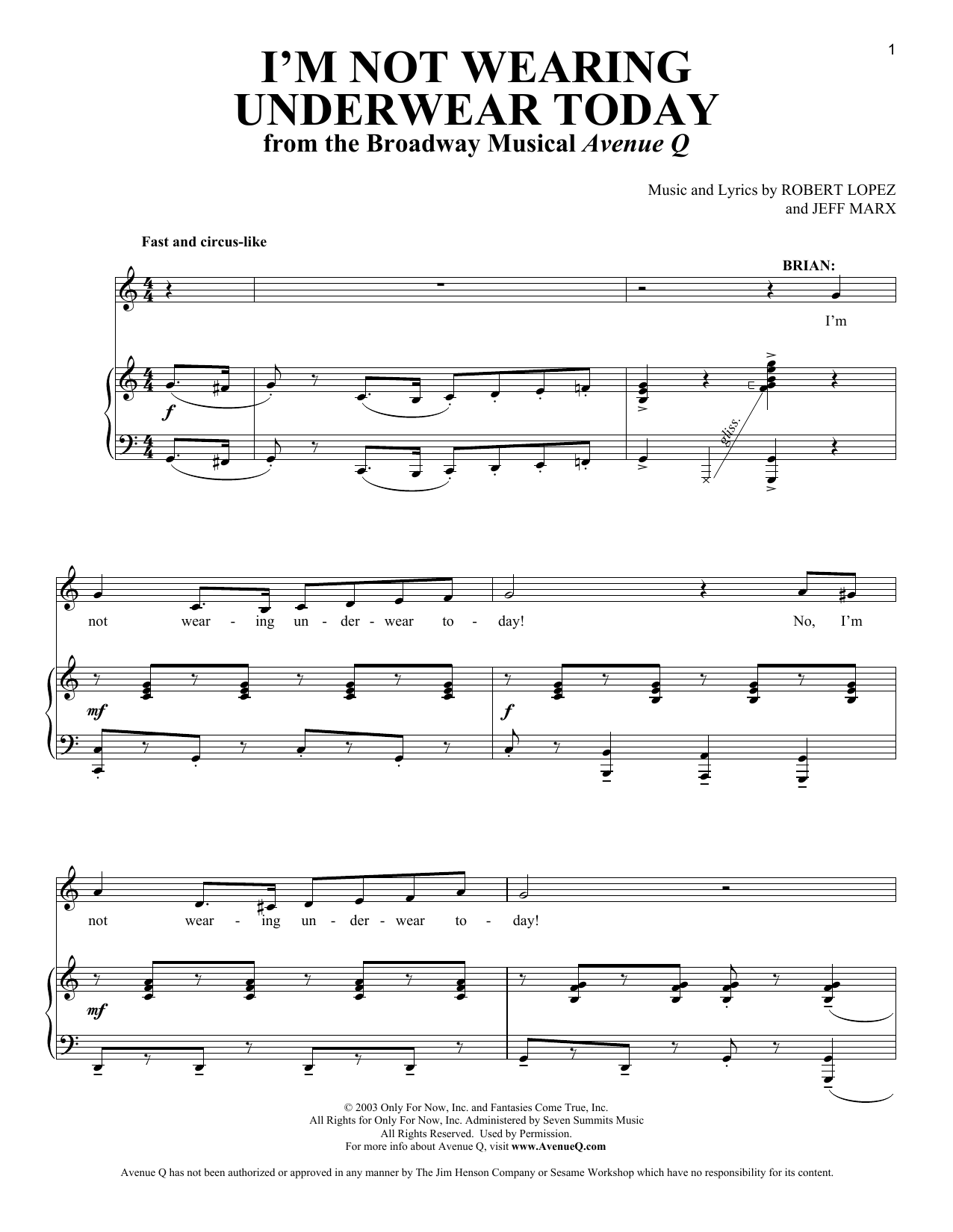 Download or print Robert Lopez & Jeff Marx I'm Not Wearing Underwear Today (from Avenue Q) sheet music, chords and digital score arranged for Piano & Vocal. This Musical/Show score includes 2 page(s).