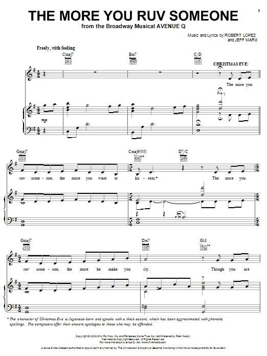 Download or print Robert Lopez & Jeff Marx The More You Ruv Someone (from Avenue Q) sheet music, chords and digital score arranged for Piano & Vocal. This Musical/Show score includes 6 page(s).