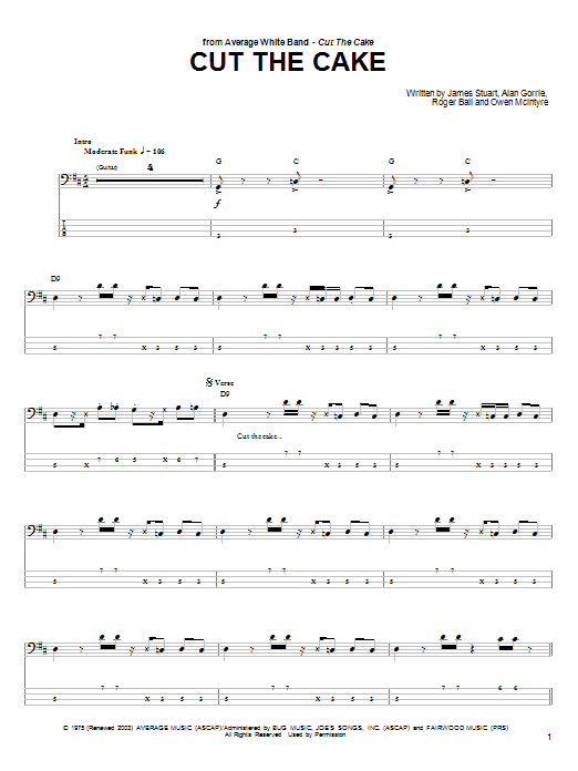 Download or print Average White Band Cut The Cake sheet music, chords and digital score arranged for Bass Guitar Tab. This Funk score includes 5 page(s).
