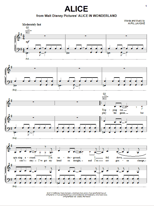 Download or print Avril Lavigne Alice sheet music, chords and digital score arranged for Piano, Vocal & Guitar Chords (Right-Hand Melody). This Disney score includes 7 page(s).