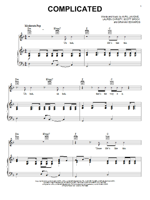 Download or print Avril Lavigne Complicated sheet music, chords and digital score arranged for Guitar Chords/Lyrics. This Rock score includes 3 page(s).