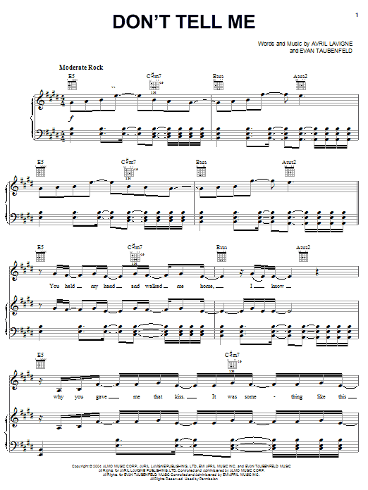 Download or print Avril Lavigne Don't Tell Me sheet music, chords and digital score arranged for Easy Piano. This Rock score includes 6 page(s).