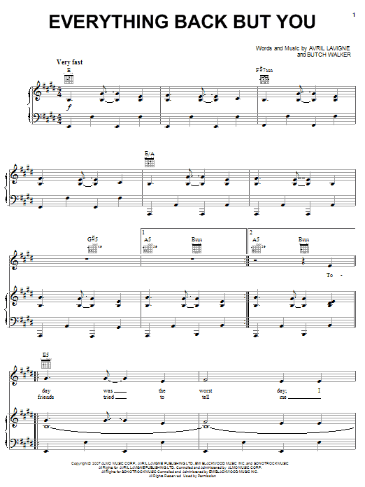 Download or print Avril Lavigne Everything Back But You sheet music, chords and digital score arranged for Piano, Vocal & Guitar Chords (Right-Hand Melody). This Pop score includes 9 page(s).