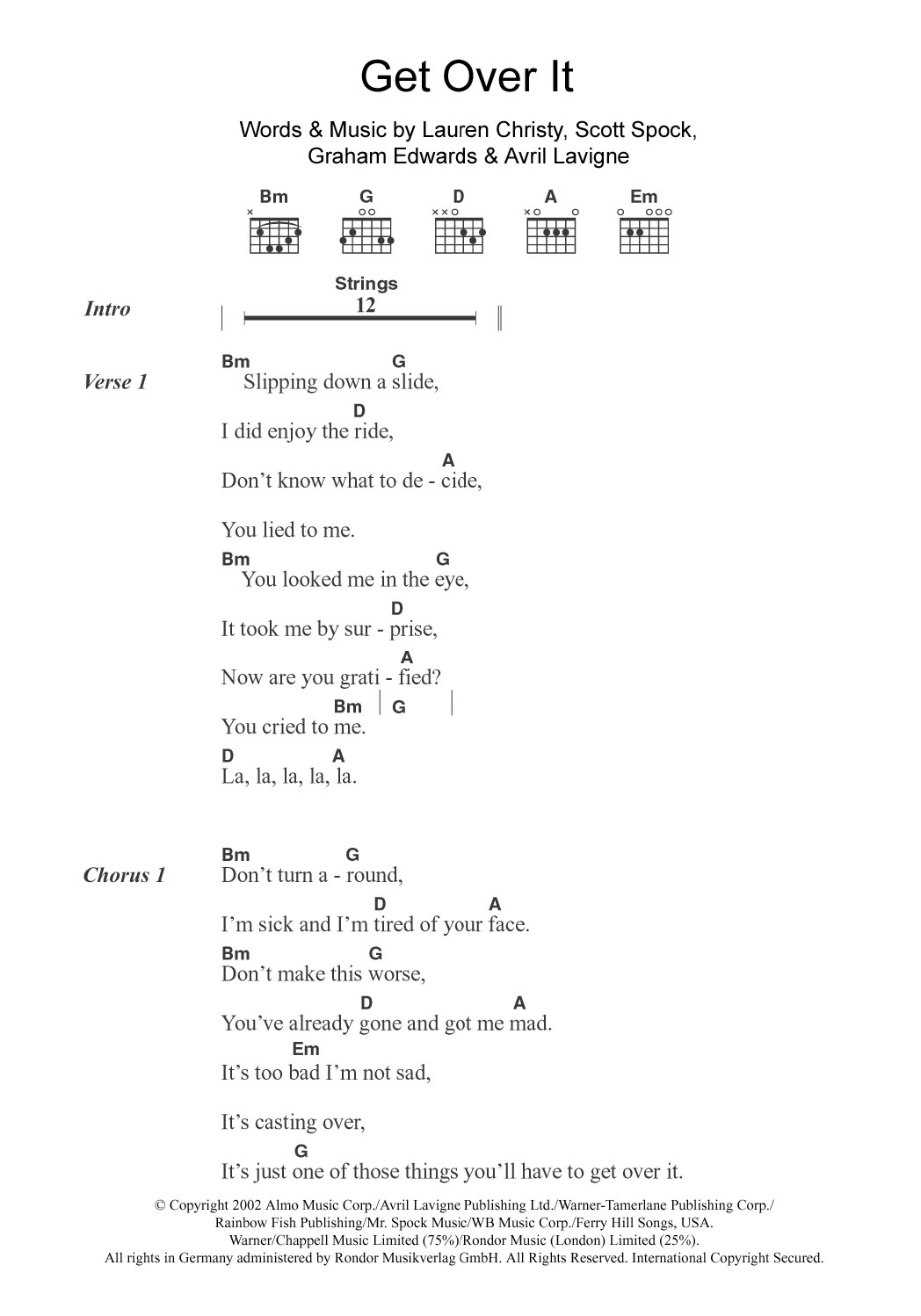 Download or print Avril Lavigne Get Over It sheet music, chords and digital score arranged for Guitar Chords/Lyrics. This Pop score includes 3 page(s).