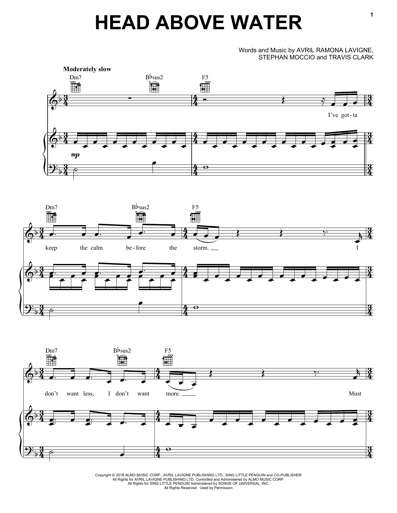 Download or print Avril Lavigne Head Above Water sheet music, chords and digital score arranged for Piano, Vocal & Guitar Chords (Right-Hand Melody). This Pop score includes 6 page(s).