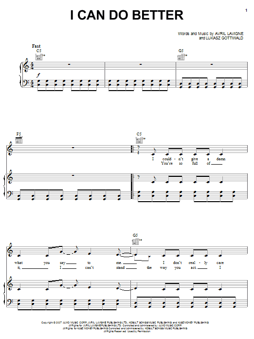 Download or print Avril Lavigne I Can Do Better sheet music, chords and digital score arranged for Piano, Vocal & Guitar Chords (Right-Hand Melody). This Pop score includes 8 page(s).