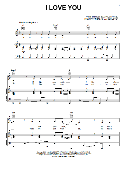 Download or print Avril Lavigne I Love You sheet music, chords and digital score arranged for Piano, Vocal & Guitar Chords (Right-Hand Melody). This Pop score includes 5 page(s).
