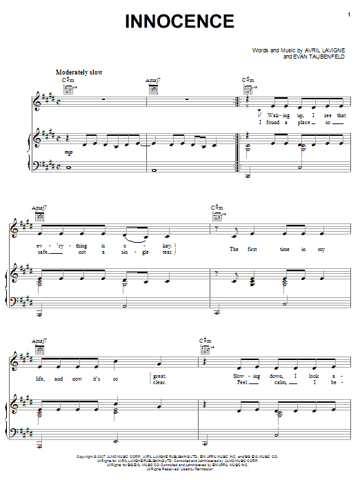 Download or print Avril Lavigne Innocence sheet music, chords and digital score arranged for Piano, Vocal & Guitar Chords (Right-Hand Melody). This Pop score includes 9 page(s).