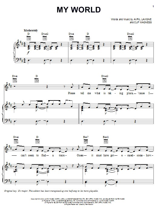 Download or print Avril Lavigne My World sheet music, chords and digital score arranged for Guitar Chords/Lyrics. This Pop score includes 3 page(s).