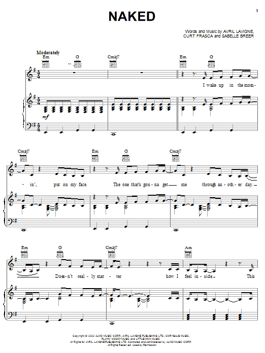 Download or print Avril Lavigne Naked sheet music, chords and digital score arranged for Guitar Chords/Lyrics. This Pop score includes 3 page(s).