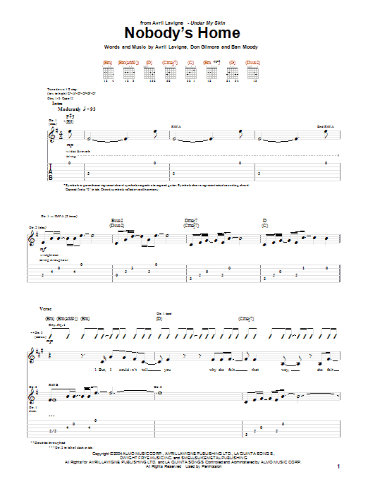 Download or print Avril Lavigne Nobody's Home sheet music, chords and digital score arranged for Piano, Vocal & Guitar Chords (Right-Hand Melody). This Pop score includes 4 page(s).