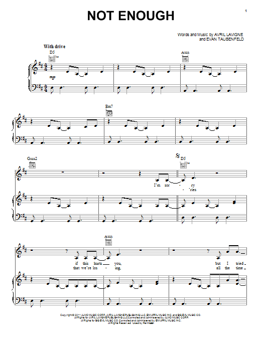 Download or print Avril Lavigne Not Enough sheet music, chords and digital score arranged for Piano, Vocal & Guitar Chords (Right-Hand Melody). This Pop score includes 9 page(s).