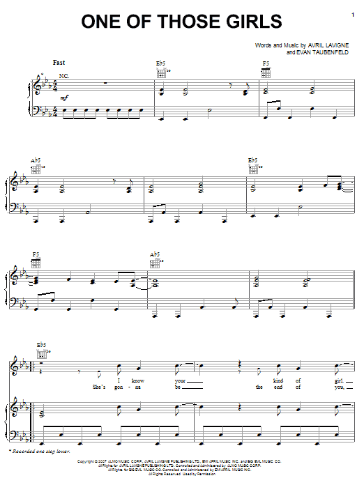Download or print Avril Lavigne One Of Those Girls sheet music, chords and digital score arranged for Piano, Vocal & Guitar Chords (Right-Hand Melody). This Pop score includes 8 page(s).