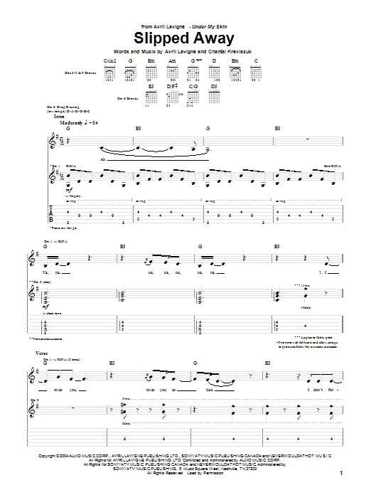 Download or print Avril Lavigne Slipped Away sheet music, chords and digital score arranged for Guitar Tab. This Pop score includes 9 page(s).
