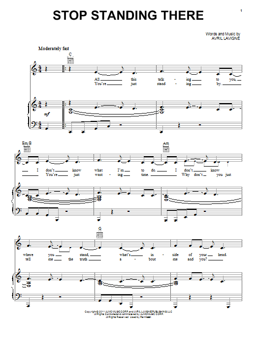 Download or print Avril Lavigne Stop Standing There sheet music, chords and digital score arranged for Piano, Vocal & Guitar Chords (Right-Hand Melody). This Pop score includes 7 page(s).