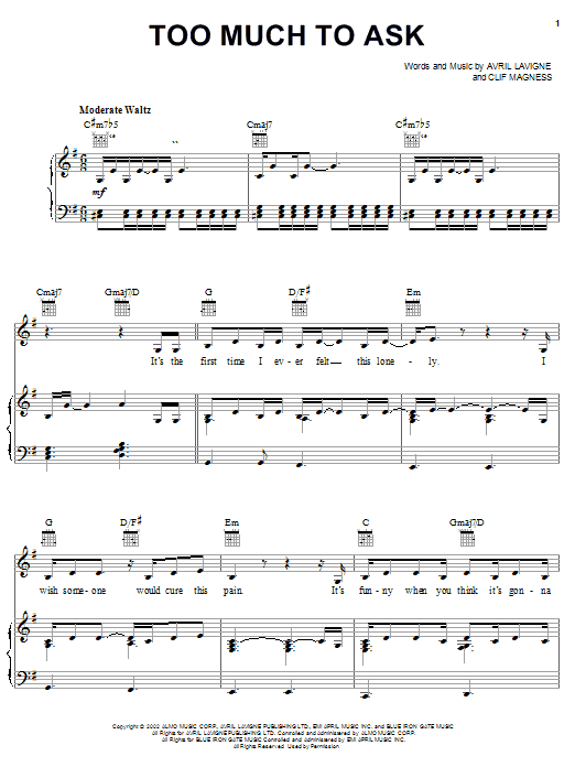 Download or print Avril Lavigne Too Much To Ask sheet music, chords and digital score arranged for Easy Piano. This Pop score includes 9 page(s).