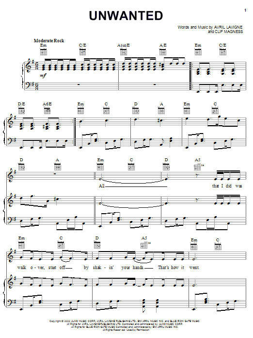 Download or print Avril Lavigne Unwanted sheet music, chords and digital score arranged for Easy Piano. This Pop score includes 11 page(s).