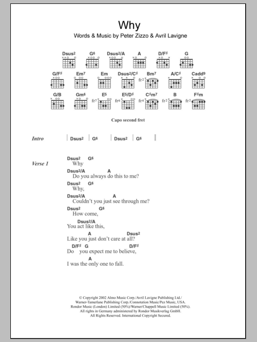 Download or print Avril Lavigne Why sheet music, chords and digital score arranged for Guitar Chords/Lyrics. This Pop score includes 4 page(s).