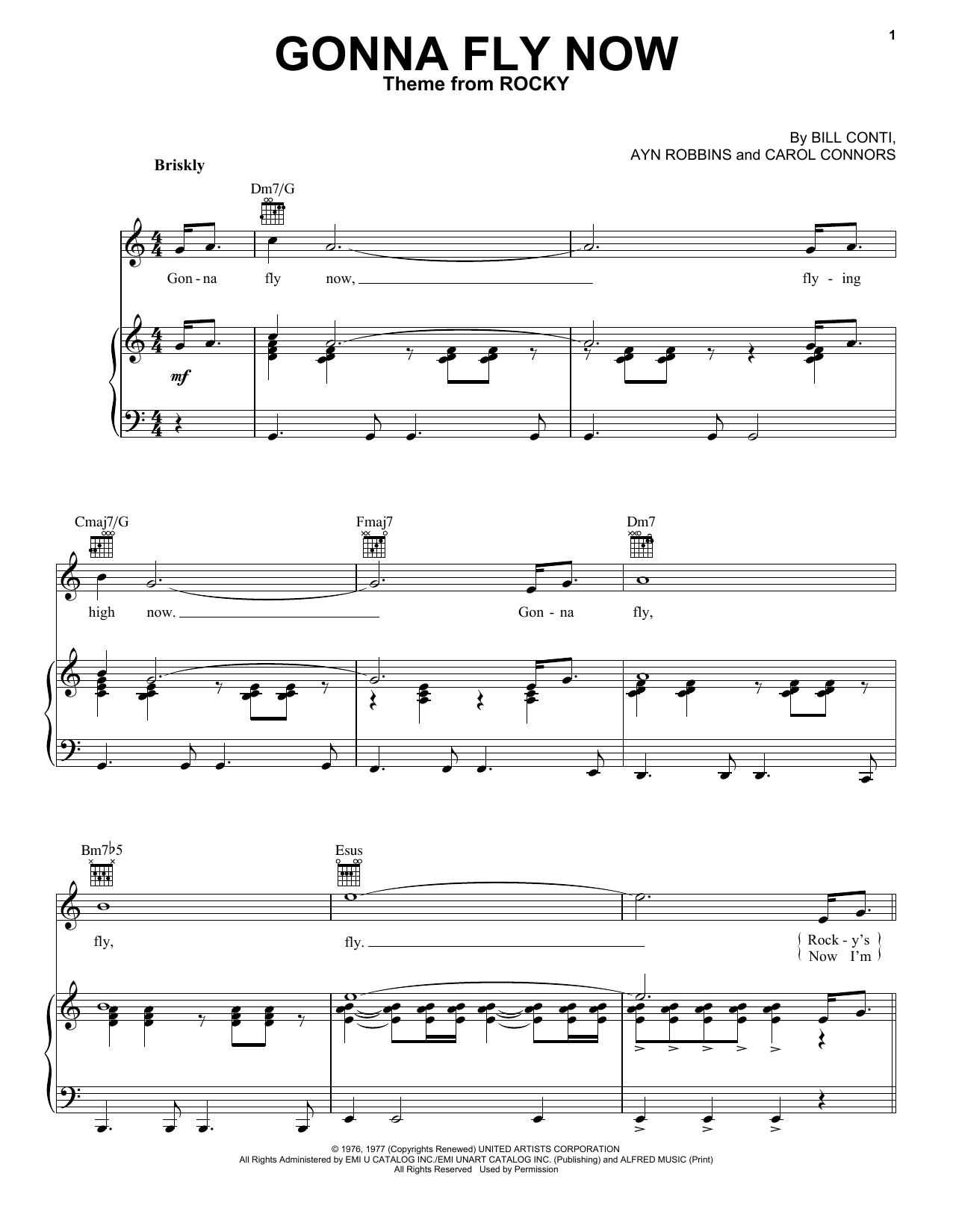 Download or print Bill Conti Gonna Fly Now (Theme from Rocky) sheet music, chords and digital score arranged for Piano, Vocal & Guitar Chords (Right-Hand Melody). This Pop score includes 5 page(s).