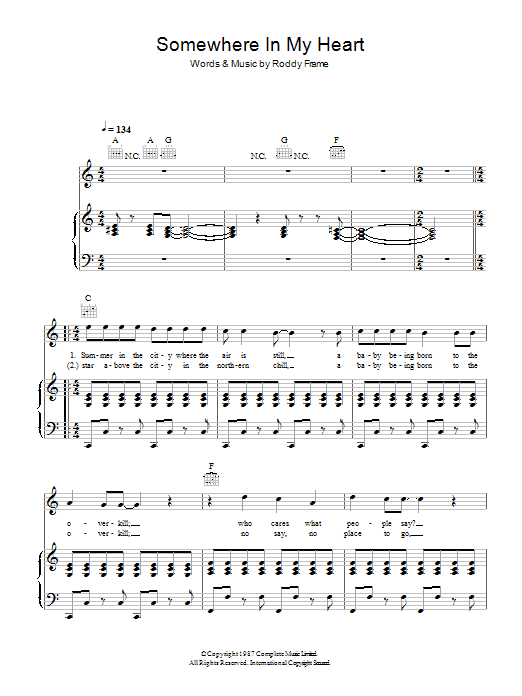 Download or print Aztec Camera Somewhere In My Heart sheet music, chords and digital score arranged for Guitar Chords/Lyrics. This Rock score includes 3 page(s).