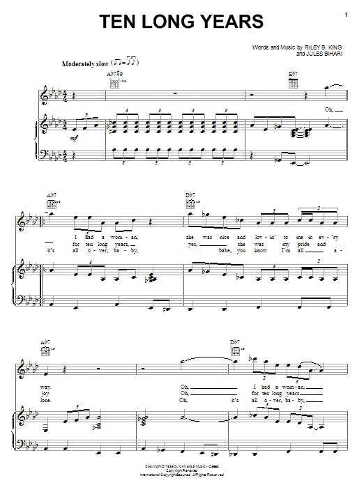 Download or print B.B. King Ten Long Years sheet music, chords and digital score arranged for Piano, Vocal & Guitar Chords (Right-Hand Melody). This Blues score includes 2 page(s).