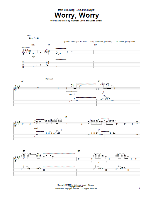 Download or print B.B. King Worry, Worry sheet music, chords and digital score arranged for Guitar Tab. This Blues score includes 9 page(s).