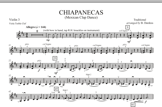 Download or print B. Dardess Chiapanecas (Mexican Clap Dance) - Violin 3 (Viola Treble Clef) sheet music, chords and digital score arranged for Orchestra. This Folk score includes 1 page(s).