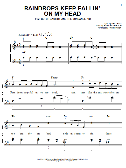 Download or print B.J. Thomas Raindrops Keep Fallin' On My Head (arr. Phillip Keveren) sheet music, chords and digital score arranged for Easy Piano. This Pop score includes 3 page(s).