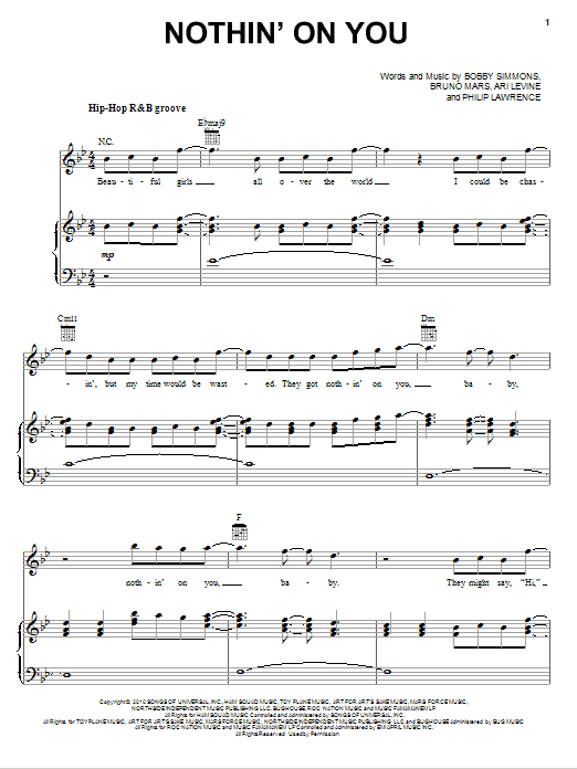 Download or print B.o.B. featuring Bruno Mars Nothin' On You sheet music, chords and digital score arranged for Piano, Vocal & Guitar Chords. This Pop score includes 8 page(s).