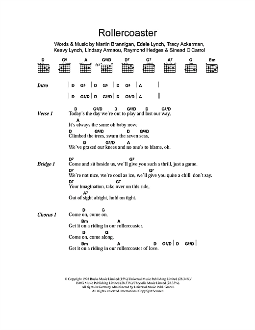 Download or print B*witched Rollercoaster sheet music, chords and digital score arranged for Guitar Chords/Lyrics. This Pop score includes 2 page(s).
