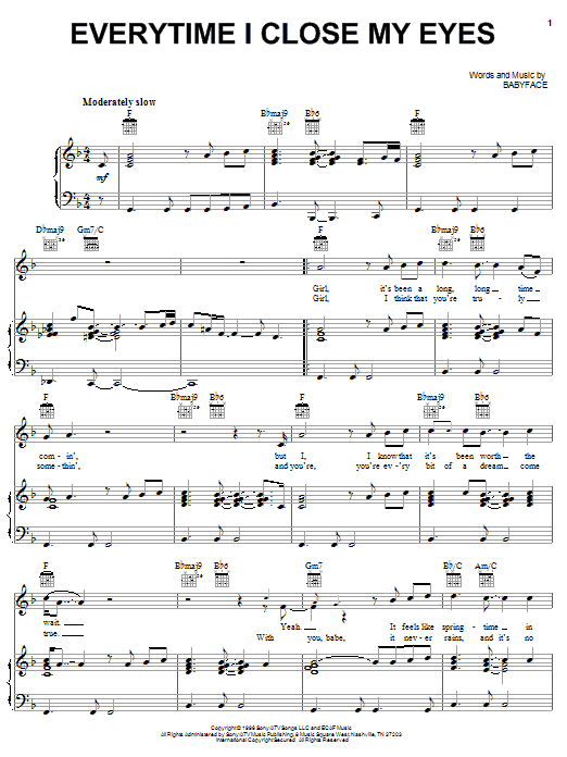 Download or print Babyface Everytime I Close My Eyes sheet music, chords and digital score arranged for Piano, Vocal & Guitar Chords (Right-Hand Melody). This Love score includes 4 page(s).