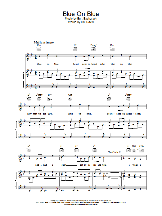 Download or print Burt Bacharach Blue On Blue sheet music, chords and digital score arranged for Piano, Vocal & Guitar Chords. This Pop score includes 4 page(s).