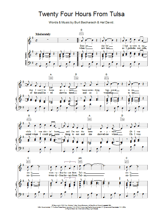 Download or print Burt Bacharach Twenty Four Hours From Tulsa sheet music, chords and digital score arranged for Piano, Vocal & Guitar Chords. This Pop score includes 3 page(s).