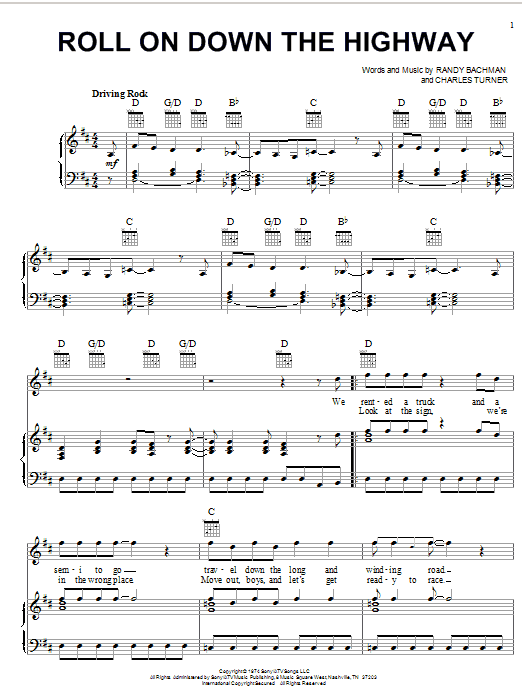 Download or print Bachman-Turner Overdrive Roll On Down The Highway sheet music, chords and digital score arranged for Piano, Vocal & Guitar Chords (Right-Hand Melody). This Pop score includes 5 page(s).