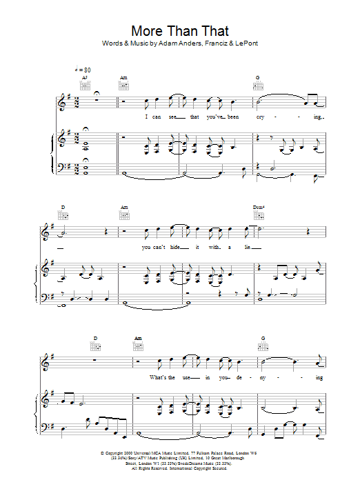 Download or print Backstreet Boys More Than That sheet music, chords and digital score arranged for Piano, Vocal & Guitar Chords (Right-Hand Melody). This Pop score includes 7 page(s).