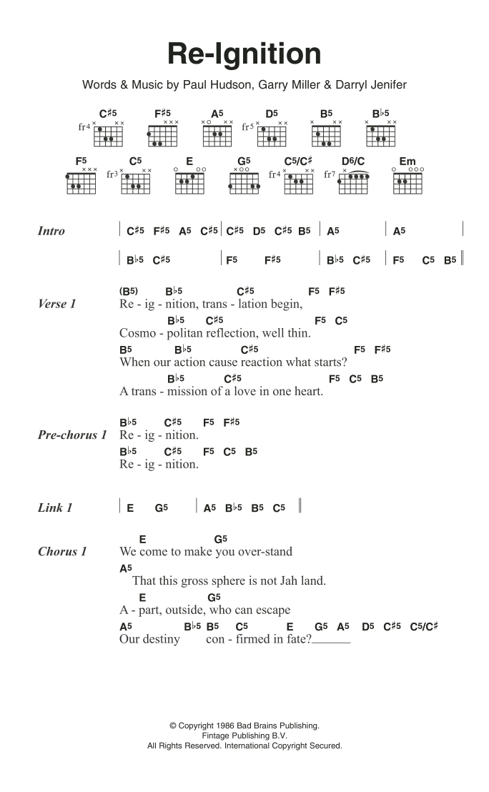 Download or print Bad Brains Re-Ignition sheet music, chords and digital score arranged for Guitar Chords/Lyrics. This Rock score includes 3 page(s).