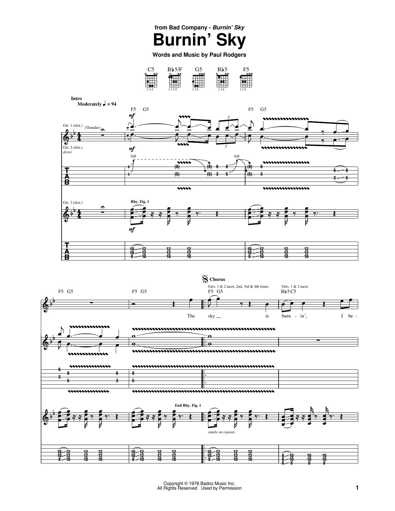 Download or print Bad Company Burnin' Sky sheet music, chords and digital score arranged for Guitar Tab. This Pop score includes 6 page(s).