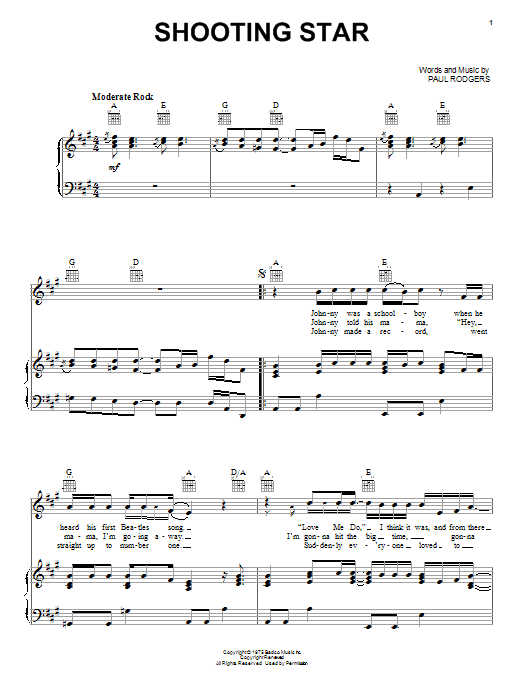 Download or print Bad Company Shooting Star sheet music, chords and digital score arranged for Piano, Vocal & Guitar Chords (Right-Hand Melody). This Pop score includes 7 page(s).