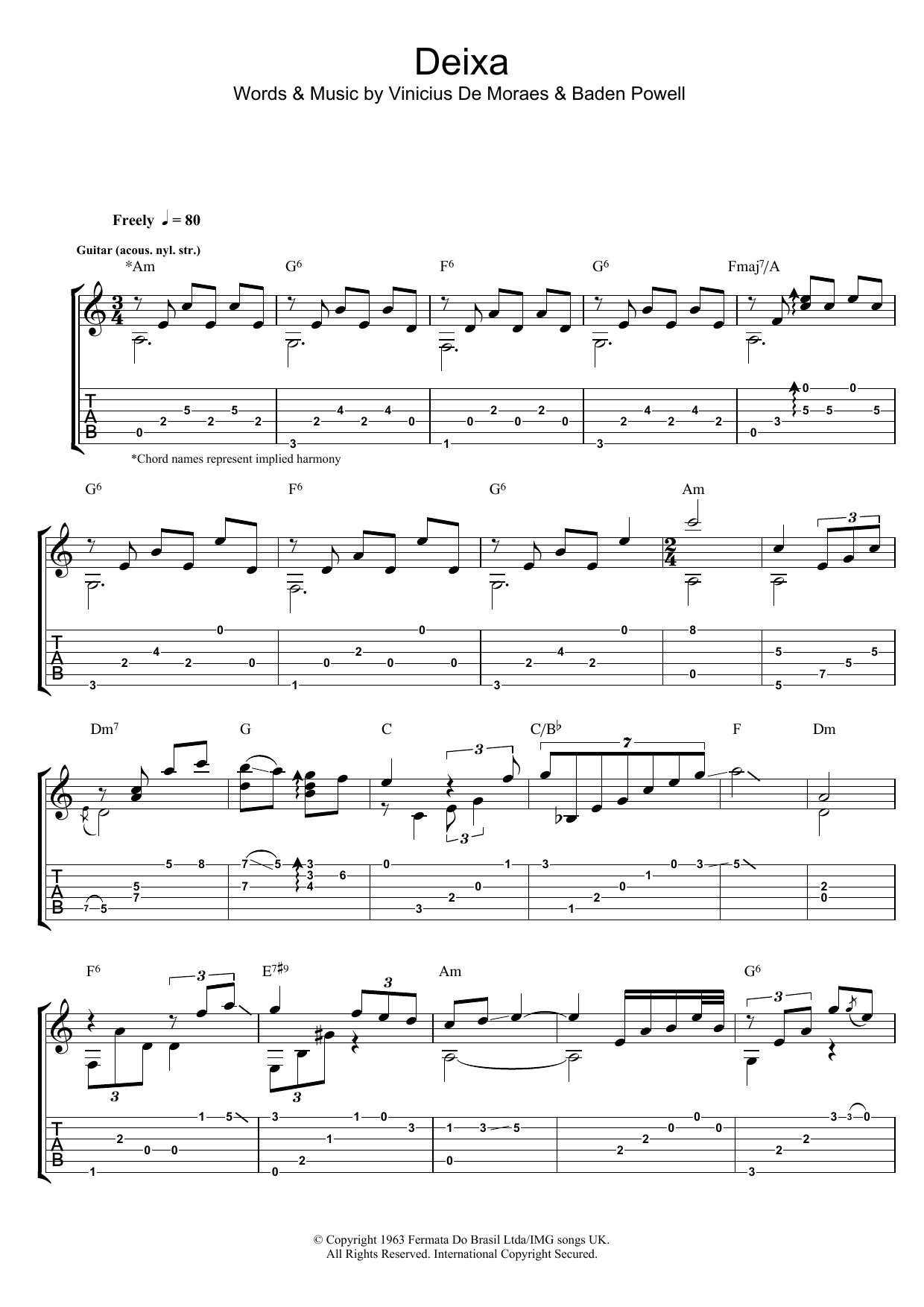 Download or print Baden Powell Deixa sheet music, chords and digital score arranged for Guitar Tab. This World score includes 6 page(s).