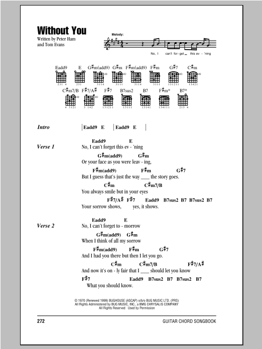 Download or print Badfinger Without You sheet music, chords and digital score arranged for Easy Guitar. This Pop score includes 2 page(s).