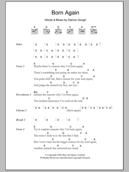 Download or print Badly Drawn Boy Born Again sheet music, chords and digital score arranged for Guitar Chords/Lyrics. This Rock score includes 2 page(s).
