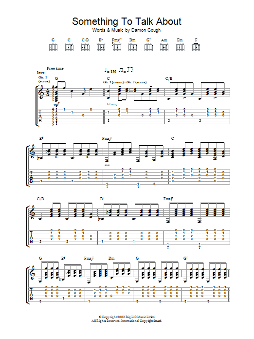 Download or print Badly Drawn Boy Something To Talk About sheet music, chords and digital score arranged for Guitar Tab. This Pop score includes 5 page(s).