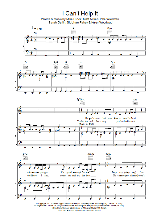 Download or print Bananarama I Can't Help It sheet music, chords and digital score arranged for Piano, Vocal & Guitar Chords. This Pop score includes 5 page(s).