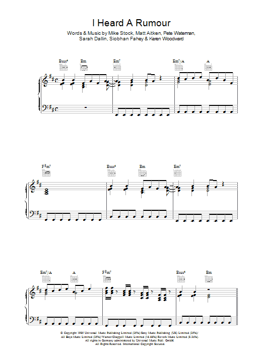 Download or print Bananarama I Heard A Rumour sheet music, chords and digital score arranged for Piano, Vocal & Guitar Chords. This Pop score includes 5 page(s).