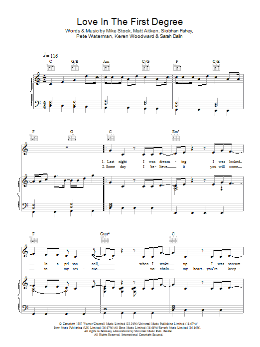Download or print Bananarama Love In The First Degree sheet music, chords and digital score arranged for Piano, Vocal & Guitar Chords. This Pop score includes 5 page(s).