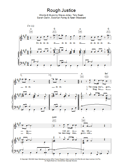 Download or print Bananarama Rough Justice sheet music, chords and digital score arranged for Piano, Vocal & Guitar Chords. This Pop score includes 5 page(s).