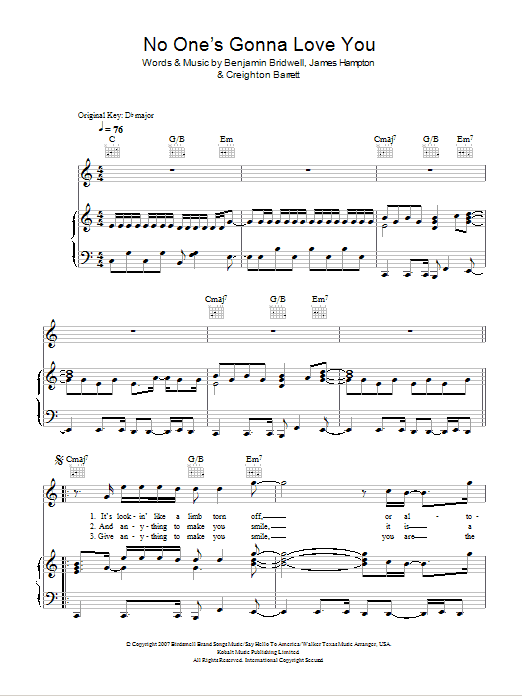 Download or print Band Of Horses No One's Gonna Love You sheet music, chords and digital score arranged for Piano, Vocal & Guitar Chords. This Alternative score includes 4 page(s).