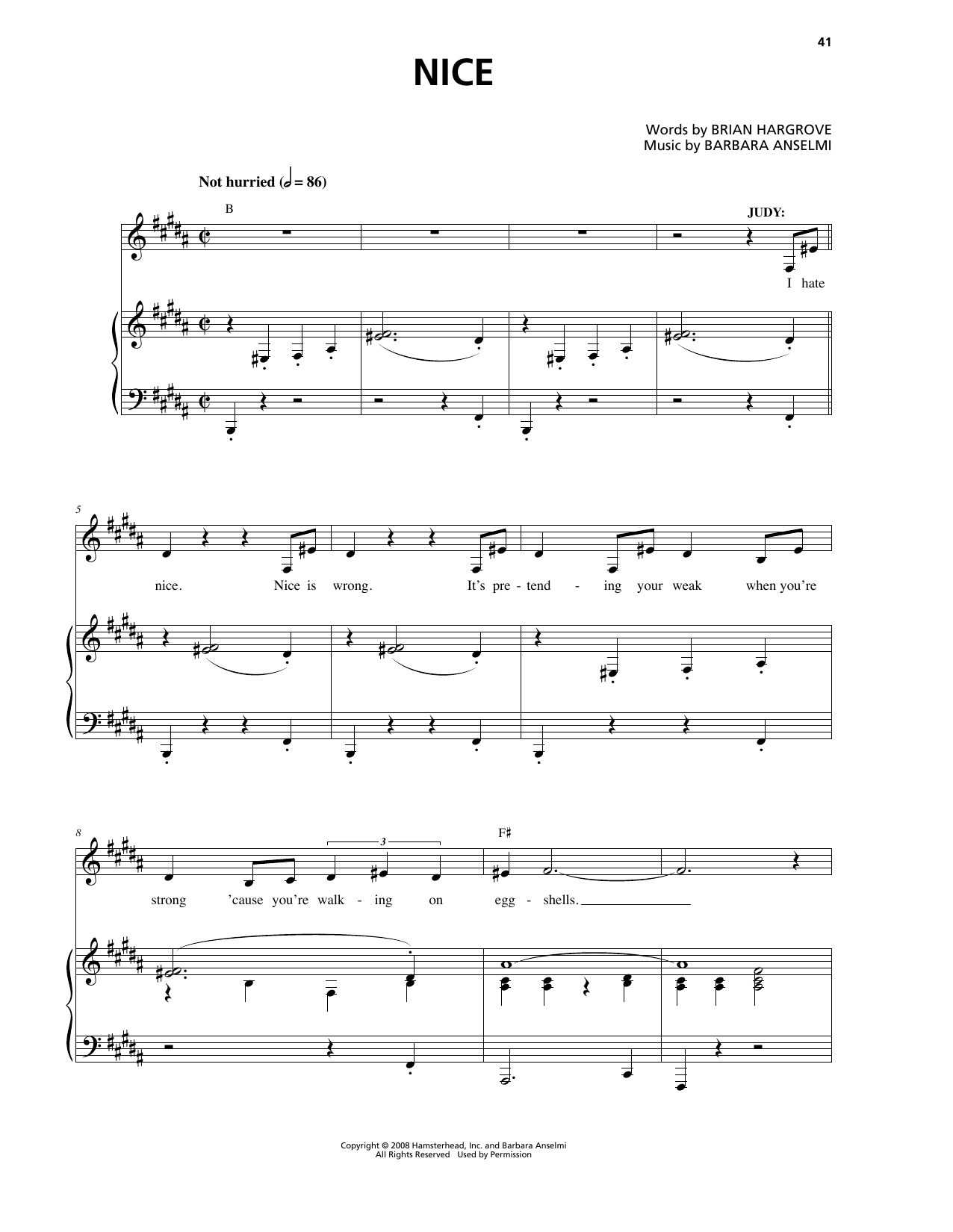 Download or print Barbara Anselmi & Brian Hargrove Nice sheet music, chords and digital score arranged for Piano & Vocal. This Musical/Show score includes 7 page(s).